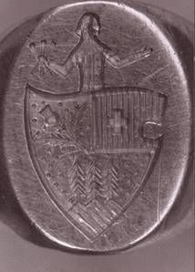 Une chevalière sert à laisser son empreinte dans une goutte de cire chaude, un peu comme un tampon. Donc, comme un tampon, le dessin sur une chevalière est à l' envers.En héraldique, le mot "dextre" désigne le côté gauche du blason, et donc droit de la chevalière. Et senestre désigne la droite, donc la gauche de la chevalière.."D'or à trois coupeaux de sinoples surmontés chacun d'un sapin de même (1), surmontés d'un chardon au naturel, la fleur tournée vers senestre (2), au franc-quartier de gueules (3) chargé d' une croisette (4) d'argent."