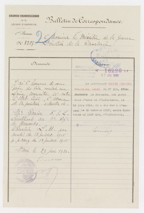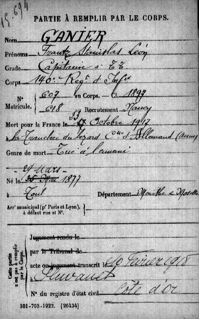 , petit fils de Henry Ganier-Tanconville, Chevalier de la Légion d'Honneur, mort au front le 17 octobre 1917, à l'âge de 40 ans.