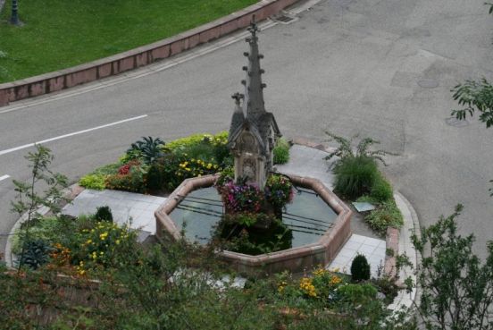Un grand bassin octogonal est alimenté par 4 bouches à eau implantées sur une pile de jet carrée couronnée d'un pinacle décoré de choux. Des faces sculptées et des fausses gargouilles complètent l'œuvre.