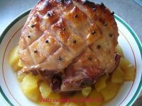 Verser le jus de la boîte sur le jambon, mettre au four th° 7 ~ 1h (jusqu'à brunissement des ananas).
