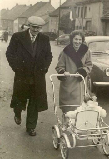 Sylvie Sistel dans la poussette et sa maman, l'homme à la moustache: un passant qui "passait" par là, le "grand Staff" de Hersbach. Le papa de Sylvie a accompagné (souvent) à l'accordéon les chanteuses et chanteurs amateurs lors des fêtes: ici Paulette Klotz épouse de Claude Ferry... une voix merveilleuse !